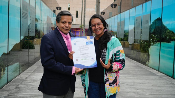 De izquierda a derecha: Emma Ruby Flórez Maldonado, Doctora en Ciencias Políticas Magister en Tecnología Educativa; Cristina Barcelona, CEO de La Agencia Mundial de Prensa, a la derecha se observa al Nobel de Paz, Adolfo Pérez Esquivel.